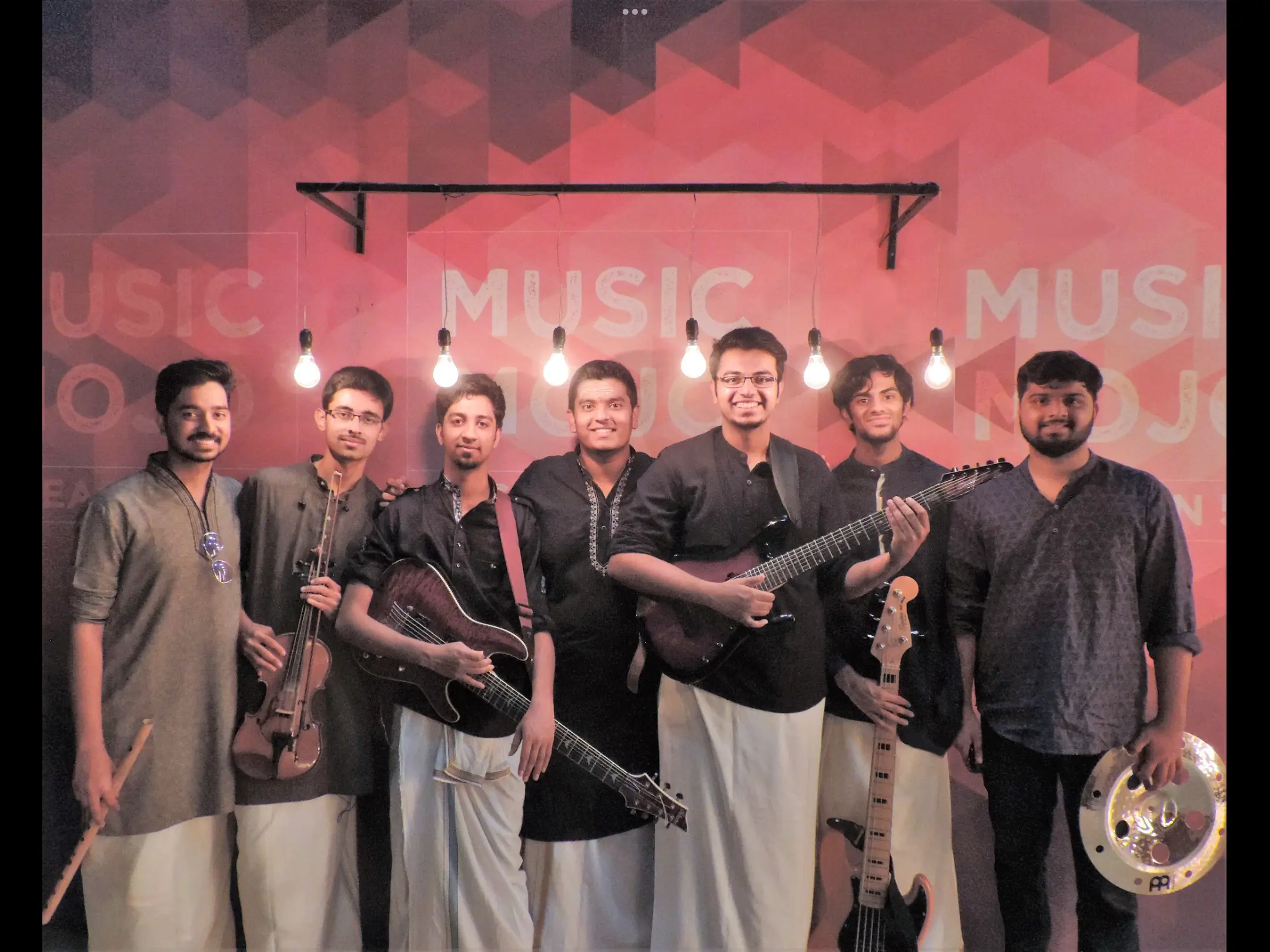 Almost all of us have grown up learning Carnatic music. Pranav (violin and vocals), Shivaraj (vocals), Sanath (Mridangam) and Anirudh (flute) have had training for 15-20 years. Sumant and Srishankar, the guitarists had lessons when they were kids, and Ram, our bassist learnt the Tabla for about 5 years. These formative experiences shaped our goal to center our fusion around Carnatic music, the one genre we all enjoy.